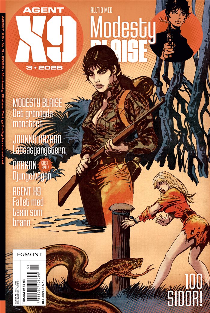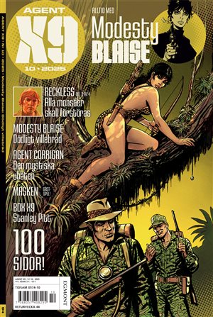 Agent X9 on ruotsinkielinen sarjakuvalehti, joka tarjoaa lukijoilleen täyden paketin toimintaa, jännitystä ja rikosmysteerien kiehtovaa maailmaa. Lehden keskiössä on älykäs ja itsenäinen Modesty Blaise, peloton naissankari, joka hoitaa tehtävänsä kylmänviileällä tarkkuudella ja säilyttää viehätysvoimansa sukupolvesta toiseen. Hän on todellinen ikoninen hahmo, joka on tehnyt pysyvän vaikutuksen sarjakuvien maailmaan.