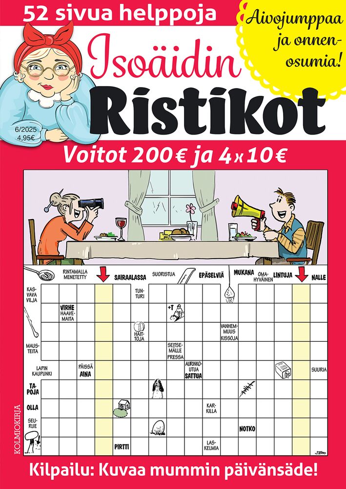 Isoäidin Ristikot on uusi suosikkilehti kaikille, jotka rakastavat lempeää huumoria, selkeitä ristikoita ja yhteisöllistä tekemistä. Tämä lämminhenkinen ristikkolehti tarjoaa vain Suomen parhaiden laatijoiden helppoja ja hauskoja kuvaristikoita, joiden vihjeet ja sanasto on suunniteltu olemaan helposti ymmärrettäviä. Lehti ei ole sidottu liiaksi nykyaikaan, vaan sen sisältö puhuttelee kaikenikäisiä ratkojia.