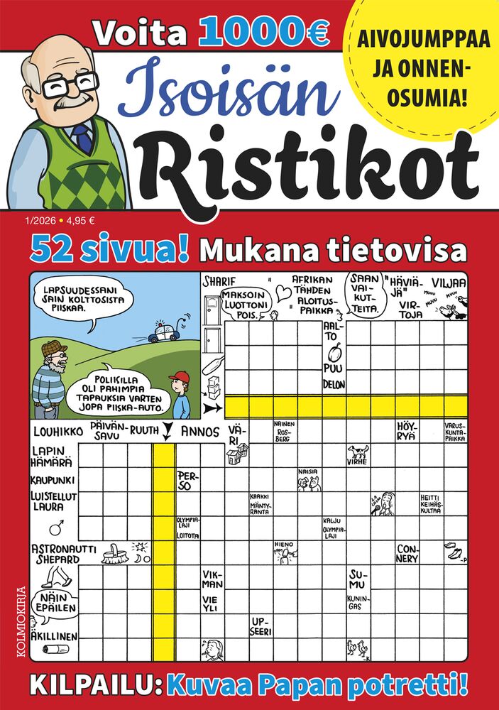 Kuusi kertaa vuodessa ilmestyvä Isoisän Ristikot on täydellinen lahjaidea: joululahjaksi, syntymäpäivälahjaksi, lahjaksi isälle, isoisälle tai vaikkapa tilaajalahjaksi itselle. Jokainen numero sisältää 52 sivua viihdyttävää ja hyväntuulista aivojumppaa. Lehdessä julkaistava hauska Papan potretti -kuvakilpailu tuo lukijoiden omat kuvat lehden sivuille, luoden mukavan muiston koko perheelle.