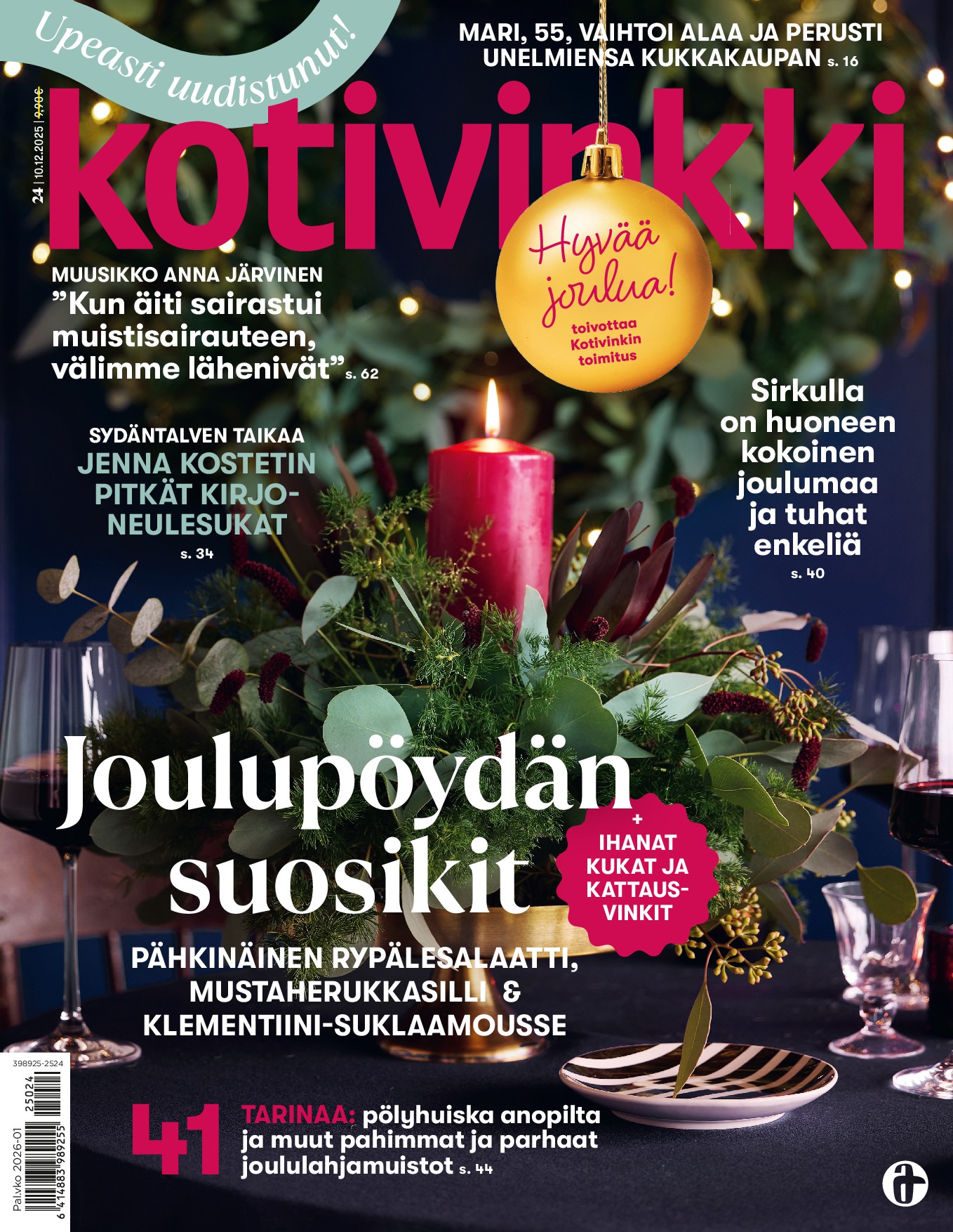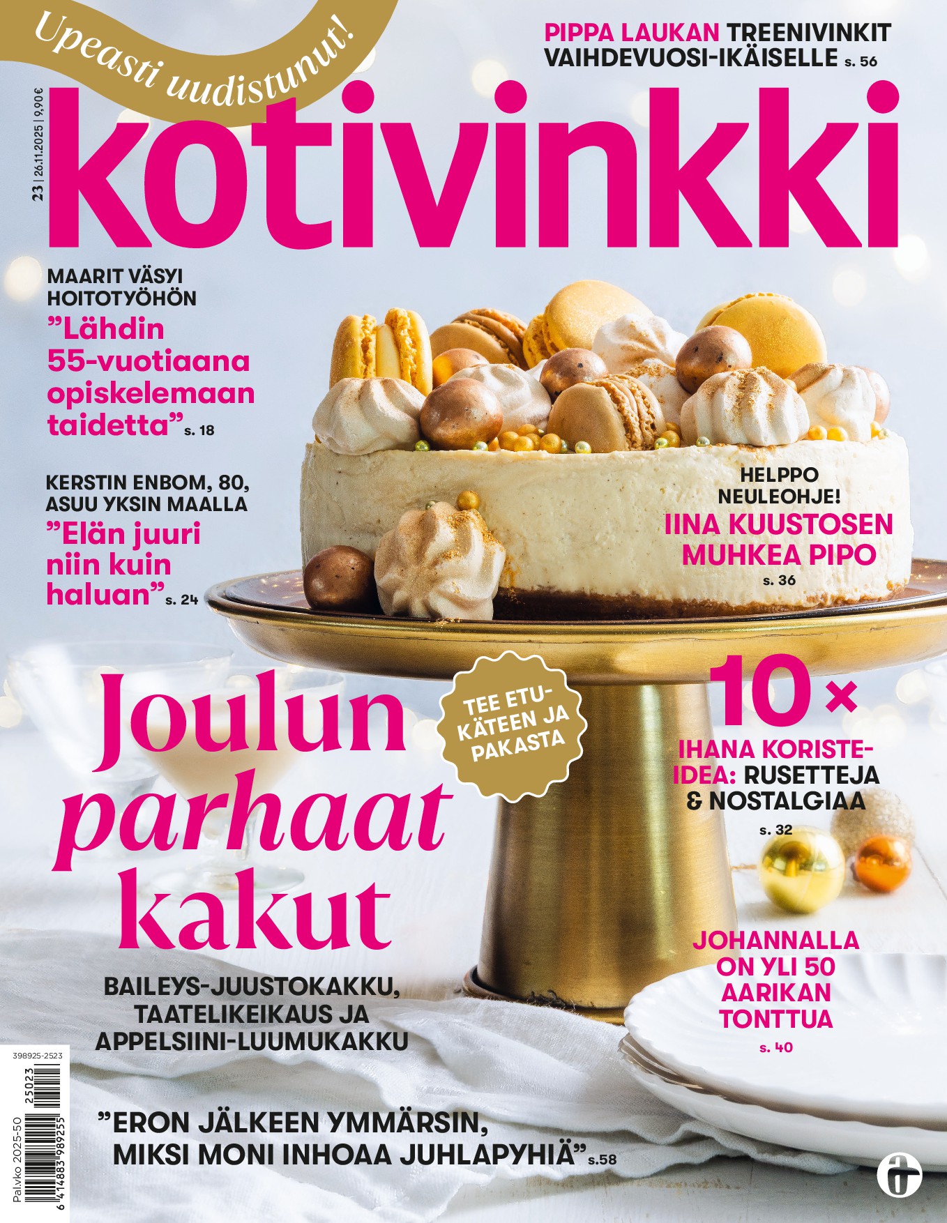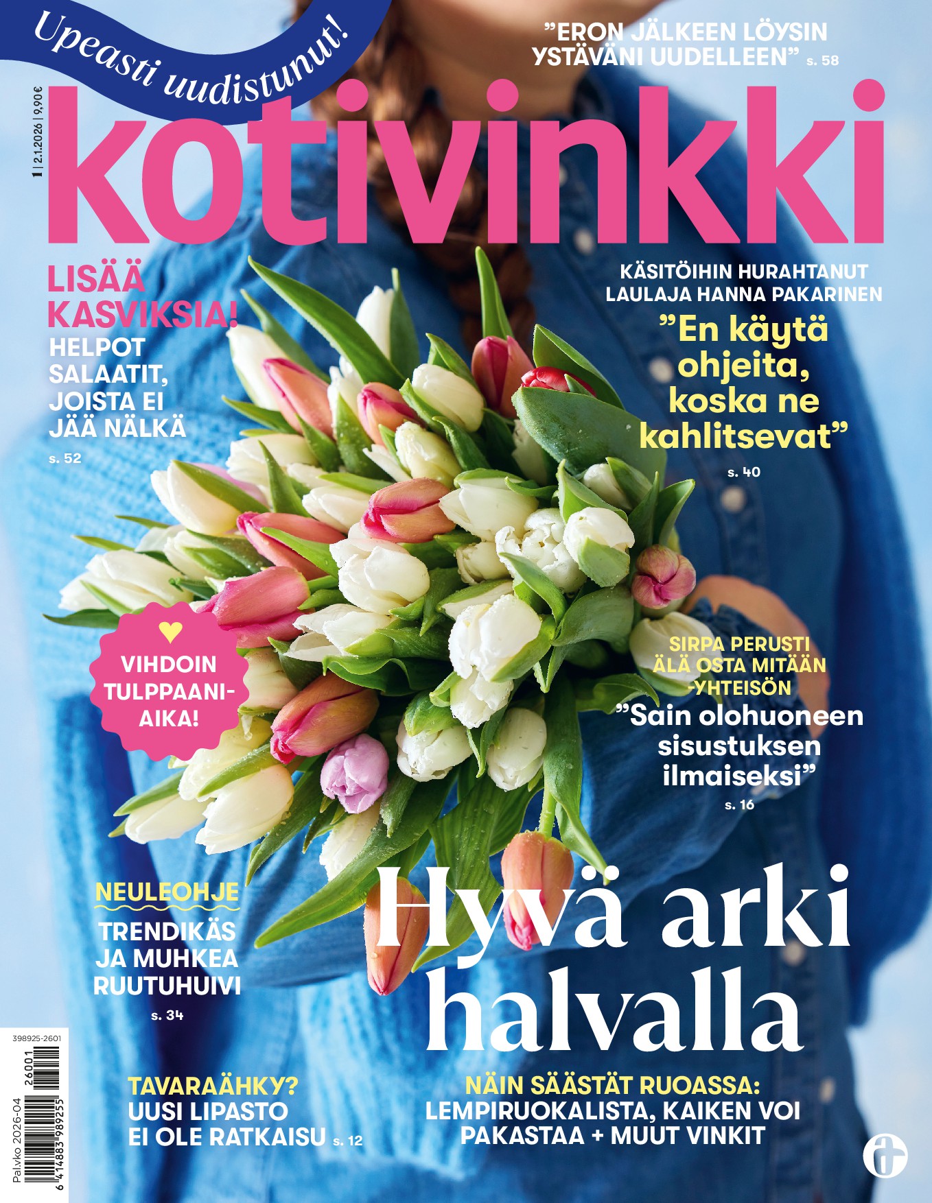 Kotivinkki on suomalaisten rakastama aikakauslehti, joka tuo kotiin iloa, inspiraatiota ja käytännöllisiä vinkkejä elämän jokaiseen hetkeen. Jos sisustaminen, herkullinen ruoka, leivonta tai diy-projektit saavat sydämesi sykkimään, on Kotivinkki juuri sinulle. Tämä monipuolinen lehti ilmestyy joka toinen viikko ja tuo säännöllisesti uutta luettavaa ja ideoita arjen ja juhlan piristykseksi.