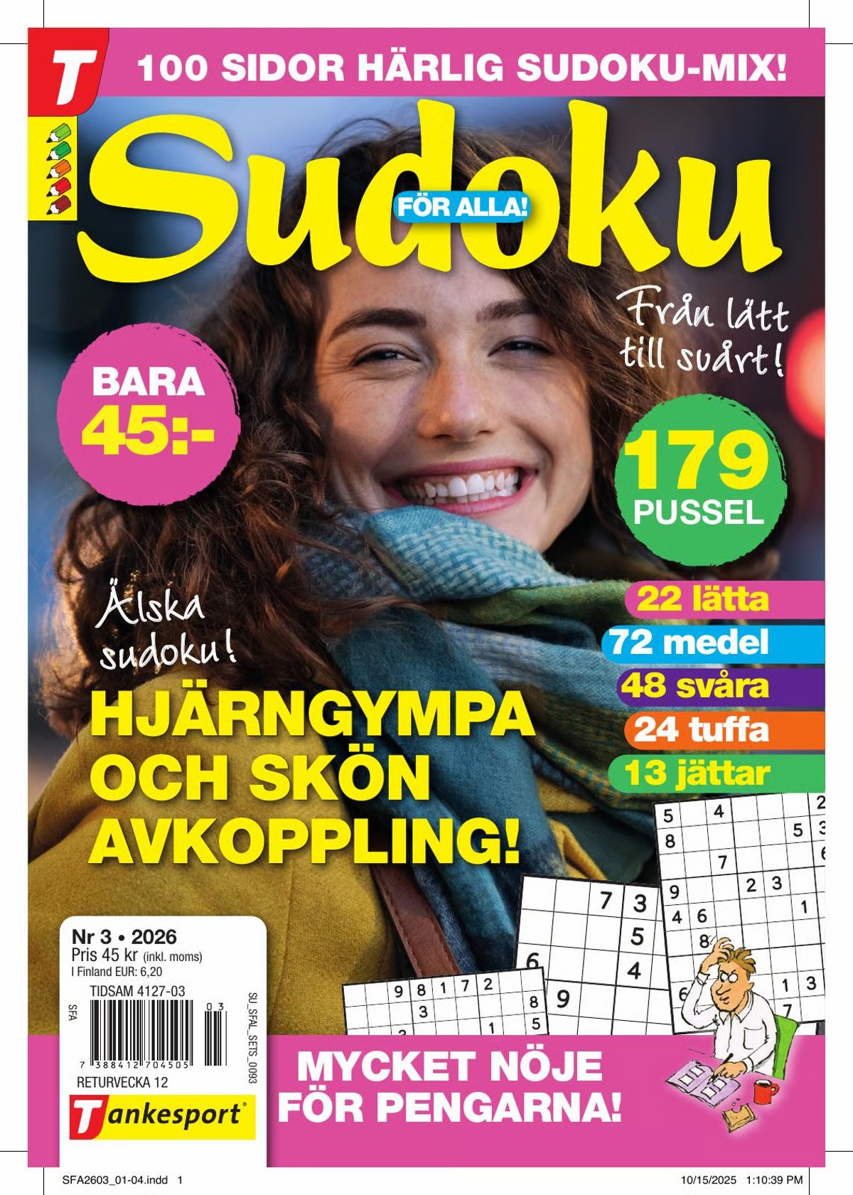 Sudoku för alla on täydellinen valinta kaikille, jotka rakastavat älyllisiä haasteita ja nauttivat sudokujen ratkomisesta missä ja milloin tahansa. Tämä kätevän kokoinen ruotsalainen tehtävälehti tarjoaa runsaasti aivojumppaa kaiken tasoisille sudokun ystäville. Pienikokoinen lehti kulkee helposti mukana, ja jokainen numero tarjoaa huikean määrän laadukkaita tehtäviä – joten tekeminen ei lopu kesken!