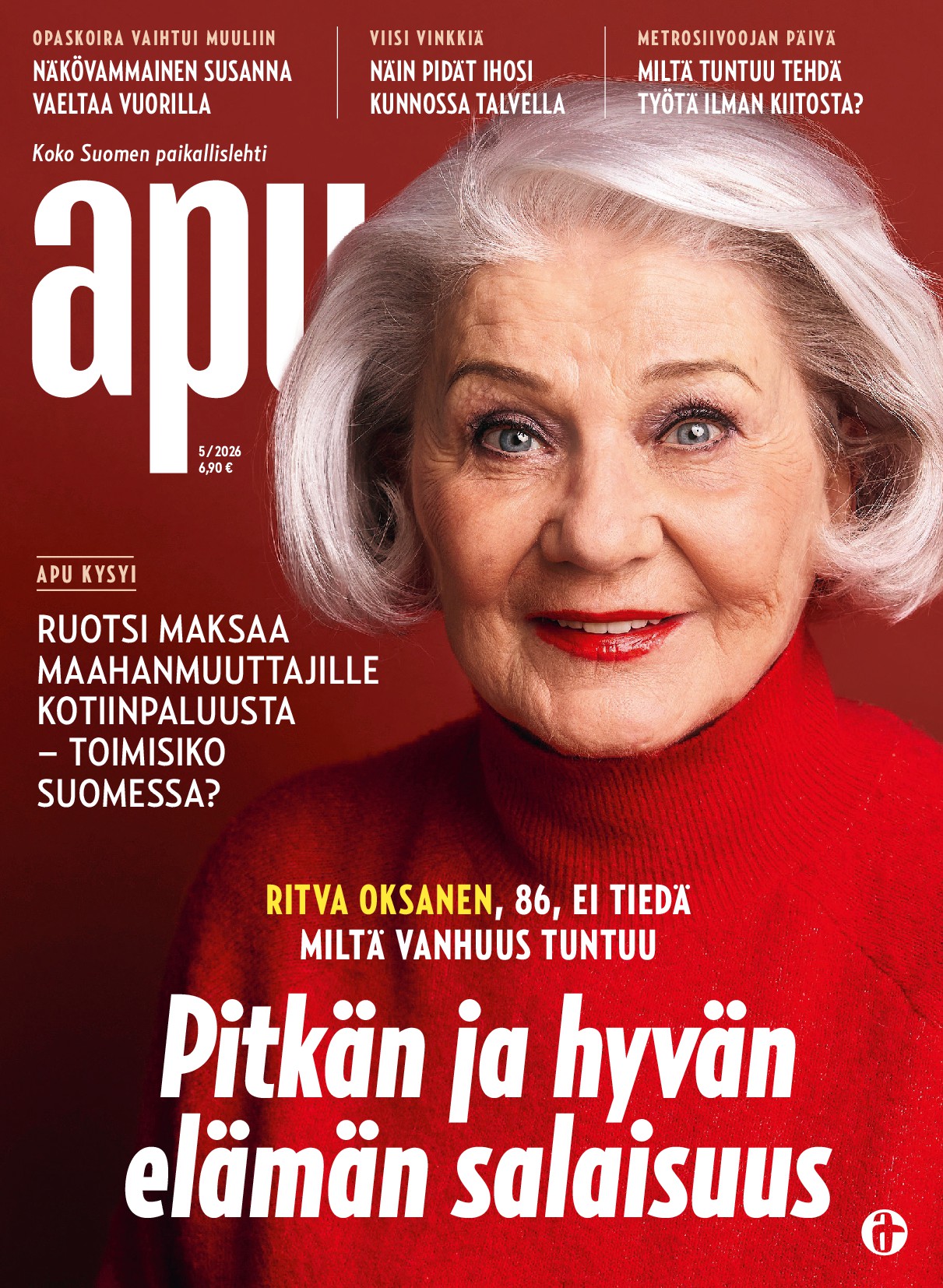 Apu-tidningen har genomgått en omfattande förnyelse och är nu djupare, ljusare och visuellt mer tilltalande än någonsin tidigare. I ett medieklimat där rubriker ofta fokuserar på det negativa erbjuder Apu balans: samhällsanalyser, gripande mänskliga berättelser och lättsammare underhållning – allt samlat i ett elegant redaktionellt format. Tidningens reportage går bortom ytan, och hela Finlands röst får höras, en ort i taget. Du får också ta del av temabilagor om hälsa och resor, praktiska vardagstips och tankeväckande krönikor skrivna av välkända profiler. Förnyade Apu är en intelligent och vacker följeslagare – aktuell, pålitlig och mänsklig.
