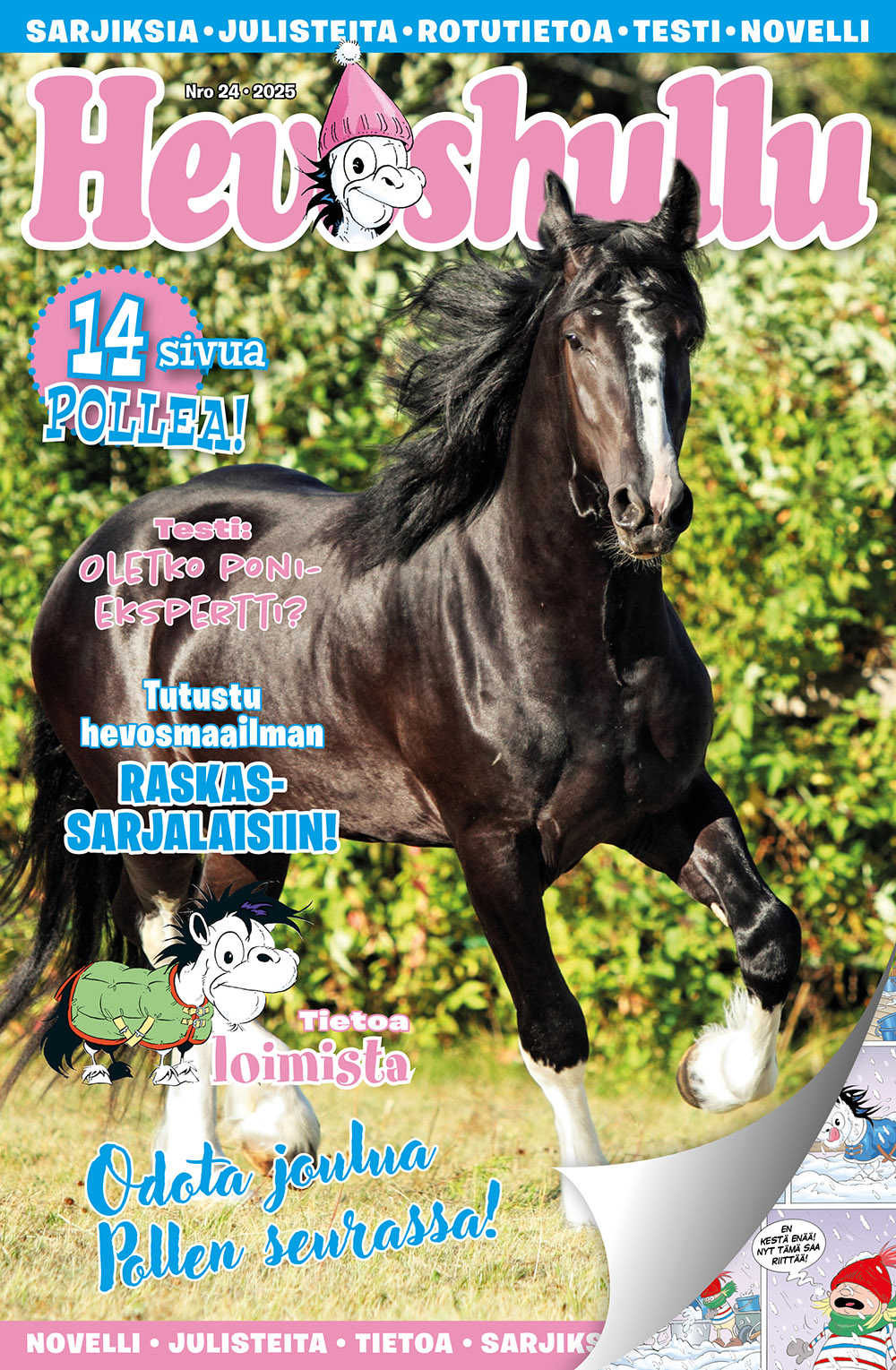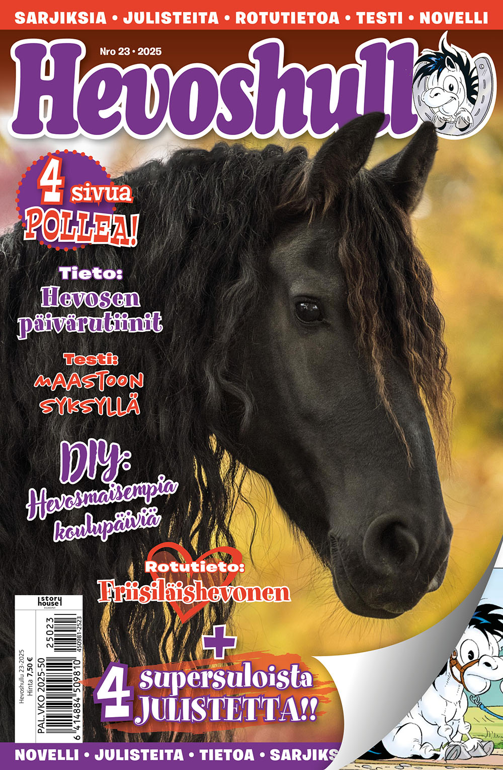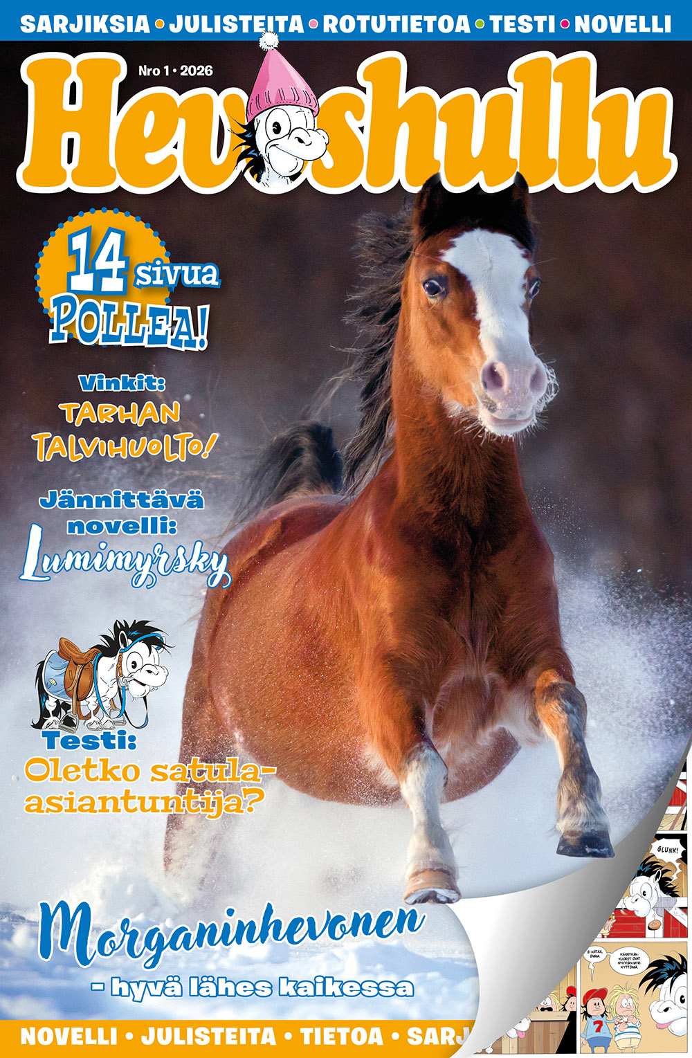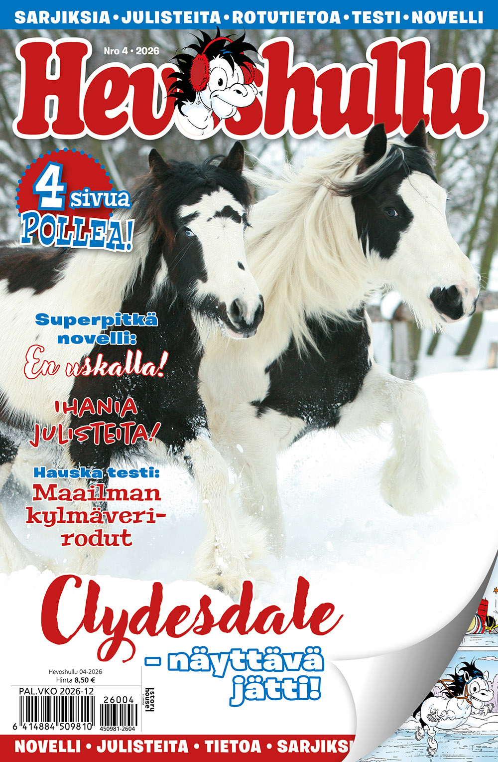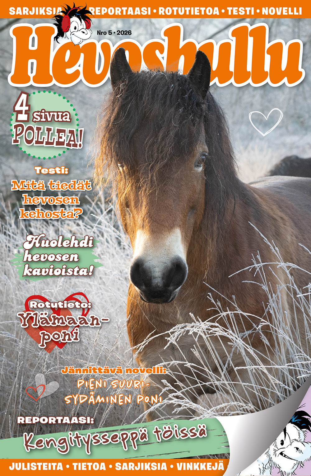 Hevoshullu-läsare kan bidra till innehållet i tidningen genom att skicka in teckningar, berättelser och åsikter. Hevoshullu erbjuder aktuell och användbar information om hästskötsel, ridning och hästsporter. Dessutom innehåller tidningen fantastiska affischer och rörande noveller om hästar. Beställ Hevoshullu till ett förmånligt pris på Lehtitukku.fi och njut av högkvalitativt innehåll 26 gånger om året.