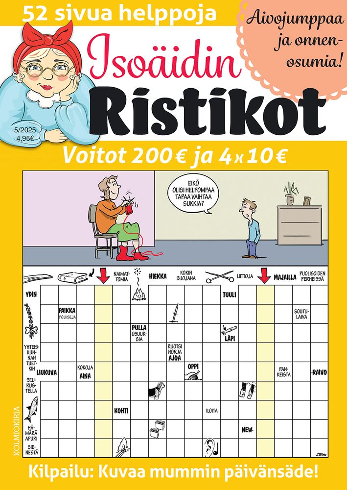 Uusi suosikkilehti Isoäidin Ristikot sisältää vain Suomen parhaiden ristikonlaatijoiden helppoja ja hauskoja kuvaristikoita. Ristikoiden joukosta löytyy sopivasti myös suosituimpia erikoistehtäviä, kuten tavuristikoita. Kuusi kertaa vuodessa ilmestyvän Isoäidin ristikoiden 52-sivuinen sisältö on tuhti paketti rentouttavaa aivojumppaa. Lehden ristikot ovat vihjeiltään ja sanastoltaan helposti ymmärrettäviä eivätkä liiaksi nykyaikaan sidonnaisia. Tehtävistä löytyy myös aimo annos leppoisaa huumoria.Erityistä Isoäidin Ristikoille on joka numerossa toistuva Mummin päivänsäde -uutuuskilpailu, jossa ratkojat saavat lähettää lehteen kuvia esimerkiksi lapsenlapsistaan. Kuvista hauskimmat päätyvät ristikoiden pääkuviksi, jolloin lehdestä jää elinikäinen, upea muisto.Isoäidin Ristikoiden palkintotehtävistä arvotaan myös riihikuivaa rahaa.