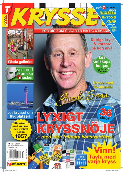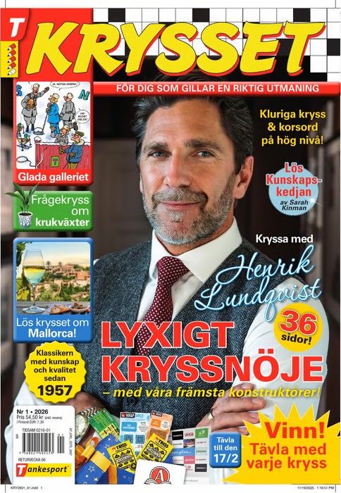 Krysset är Sveriges äldsta krysstidning som bjuder på en perfekt blandning av rykande aktuella kryss och härlig nostalgi. Med en stimulerande kombination av humor och allmänbildning, är Krysset tidningen som inte bara roar utan också gör dig lite smartare.Varje nummer av Krysset är noggrant utformat för att erbjuda en blandning av kluriga kryss som utmanar din hjärna och underhållande inslag som får dig att le. Tidningen är idealisk för både nybörjare och erfarna korsordslösare som söker kvalitet och kunskap i varje ruta.Prenumerera på Krysset och få en trogen följeslagare som gör dina stunder av avkoppling ännu mer givande. Upptäck glädjen i att lösa kryss som är både aktuella och nostalgiska, och låt dig inspireras av den rika innehållet som bjuder på allt från skämt och visdomsord till intressanta fakta och historiska anekdoter.Krysset – en tidning som inte bara underhåller, utan också berikar ditt sinne.