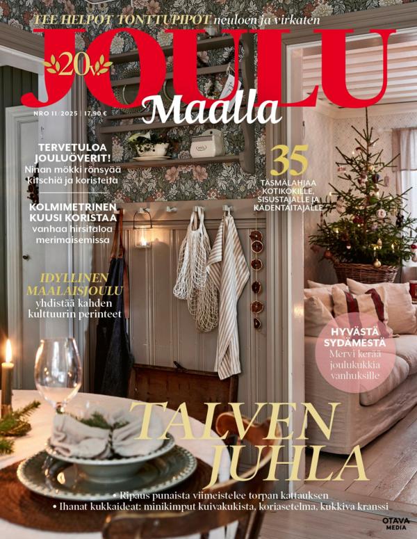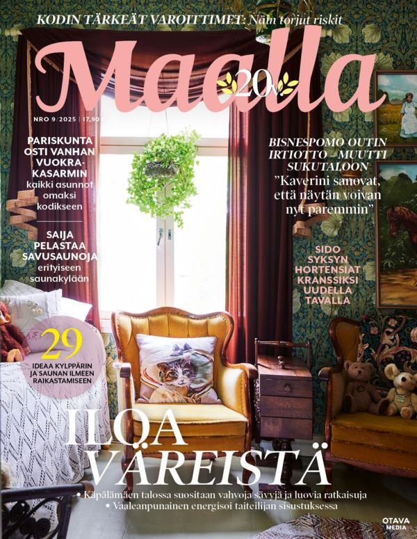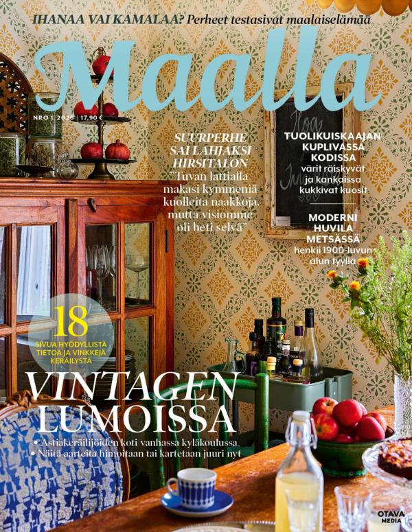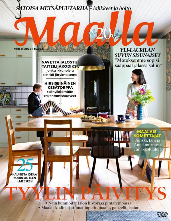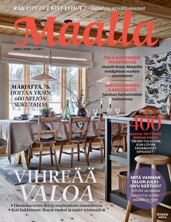 Söta stugor, stämningsfulla hem, naturnära stilar – tidningen Maalla erbjuder vacker harmoni, ingredienserna till olika drömmar och idéerna för att förverkliga dem. Förutom fräscha artiklar om inredning och hemmet, kan du också finna utsökta recept, berättelser om trädgårdar som valts med kärlek och vackra, nostalgiska objekt i varje nummer.Tidningen är på Finska