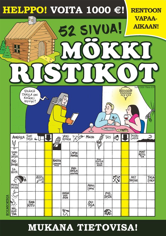 uusi kertaa vuodessa ilmestyvä 52-sivuinen tehtäväpaketti koostuu parhaiden suomalaisten ristikonlaatijoiden tehtävistä. Ristikoiden sanasto on hyvää suomen kieltä, ja ulkoasu on perinteisen selkeä. Mökkiristikot-lehden sisältö on todella monipuolinen. Pääosa tehtävistä on suosituimpia, helppoja kuvaristikoita. Lisäksi mukana on suuressa suosiossa olevia sanahakuja, kryptoja, tavuristikoita sekä sokkeloita ja väritystehtäviä, joiden parissa perheen pienempi väki viihtyy.Mökkiristikoita ratkomalla voi myös tienata riihikuivaa rahaa palkintotehtävästä ja bonuskilpailusta.