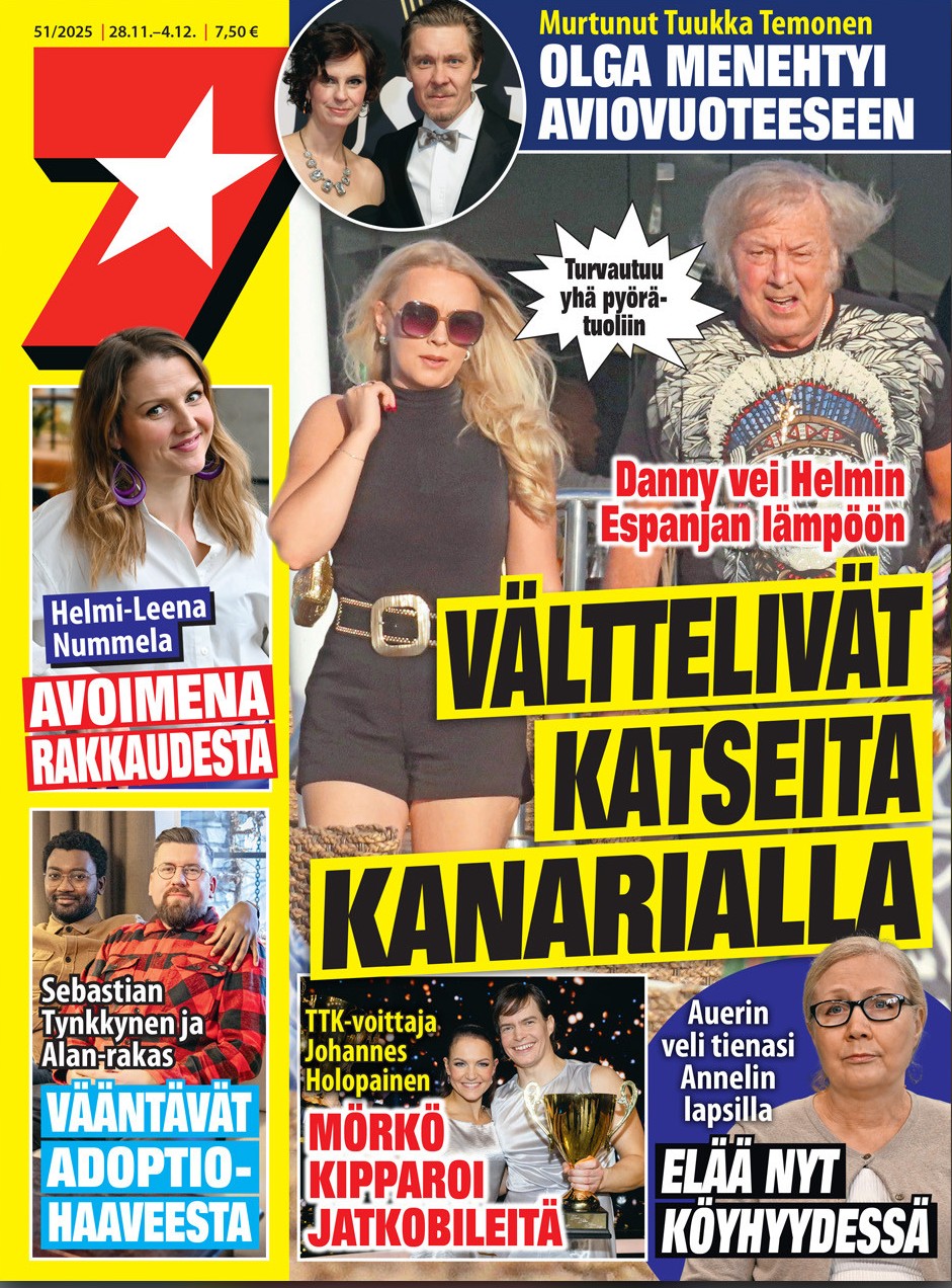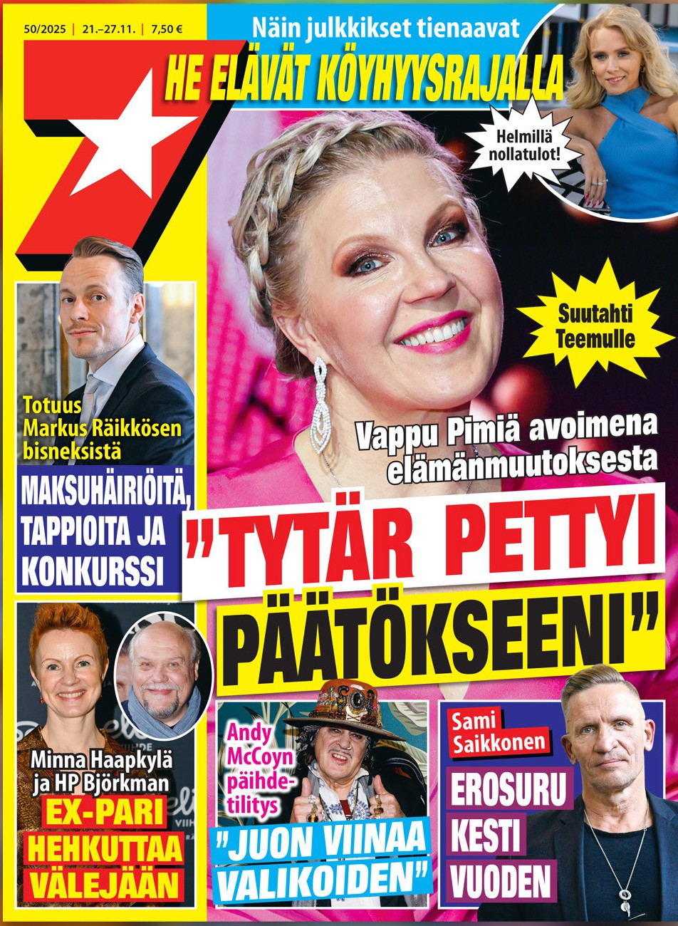 Seiska - Håll dig uppdaterad med de hetaste nöjesnyheterna!Var bland de första att höra de senaste kändisryktena genom att prenumerera på Finlands mest populära nöjestidning, Seiska! Seiska erbjuder garanterad underhållning varje vecka, fylld med kungliga nyheter, inblickar i inhemska stjärnors och F1-förarens liv, de senaste vändningarna inom musikvärlden samt de färskaste nöjesnyheterna.Seiska är alltid närvarande i sina läsares liv och ger möjlighet att delta i innehållet genom att skicka in skämt, roliga foton och feedback till kändisarna. Dessutom hittar du veckans TV-program, avslöjanden av favoritseriernas handlingar och recensioner av nya filmer i Seiska.Beställ Seiska för dig själv eller som en present till en vän enkelt och till ett förmånligt pris från Lehtitukku.fi och njut av underhållning när som helst och var som helst!Genom att beställa den tryckta tidningen accepterar du förlags (Aller Media Oy) villkor . Genom att beställa Seiska Digil accepterar du förlaget (Aller Media Oy) villkor . Genom att prenumerera bekräftar jag att jag har läst Aller Media Oy:n sekretesspolicyn.